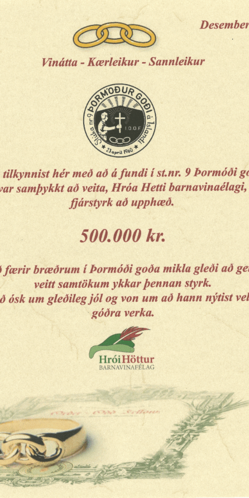 500.000 kr. styrkur frá Oddfellowstúku nr. 12 – Skúli fógeti